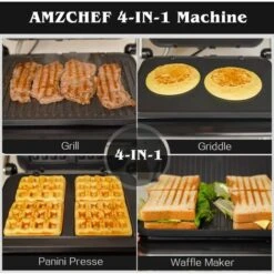 AMZCHEF 4-IN-1 Macchina (Grill Elettrico, Piastra, Piastra Panini, Waffle Maker) – 2000W Grill Elettrico Con 4 Piastre Antiaderenti Intercambiabili -180° Riscaldamento A Doppia Piastra Regolabile