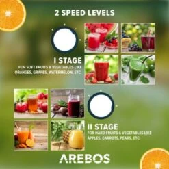 L’estrattore di AREBOS permette di ottenere in un batter d’occhio una sana carica di energia da frutta e verdura, fresca o congelata, per una dieta equilibrata: semplice, veloce, pulito e senza pre-taglio.