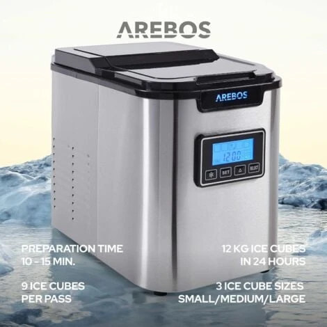 Grazie a questa perfetta ed altamente efficiente macchina per il ghiaccio in cubetti di AREBOS, che ti permette di preparare rapidamente e facilmente bevande fredde alle feste, in ufficio o in qualsiasi altro luogo tu voglia. Ideale per caffè freddo, bevande o frullati di frutta fresca da gustare nelle calde giornate estive!