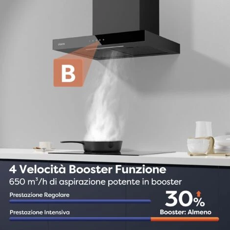 Con una potente ventilazione a 4 velocità, questa cappa elimina senza fatica fumi, grasso e odori. La modalità Booster consente di aumentare istantaneamente la velocità di estrazione al massimo (650m3/h).