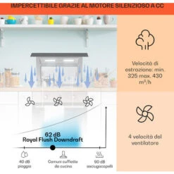 VENTOLA SILENZIOSA: Grazie alla potente portata d’aria di 430 m³/h e 4 velocità, la nostra cappa aspirante non solo filtra i fumi e riduce gli odori, ma lo fa in modo silenzioso così da permetterti di cucinare e conversare senza interruzioni.
