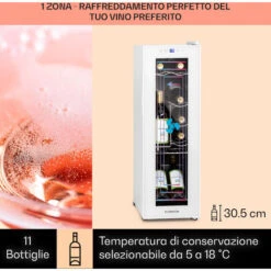 Klarstein Shiraz Cantinetta Vino, Cantina Vino Refrigerata a Zona Singola per Prosecco e Bottiglie di Birra, Con Pannello Touch, Frigo Vino per Esterno/Interno, 5-18°C, 32 Litri, 12 BottiglieLa cantinetta da vino refrigerata da 12 bottiglie ti consente di costruire e conservare una squisita collezione di vini. I frigo vino sono costruiti appositamente per proteggere una collezione di vino dai danni causati da temperature di conservazione errate, umidità, luce, vibrazioni o scarsa qualità dell’aria. Questa cantina per vino non integrata è super sottile e si adatta perfettamente a qualsiasi casa, sala degustazione, cucina o area bar interna/esterna, offrendo un rapido accesso ai tuoi migliori vini refrigerati alla loro temperatura ideale.Per Vino Bianco, Rosso e RoséIndipendentemente dalle tue preferenze, questo frigo vino a zona singola ti dà il pieno controllo del clima di conservazione. La zona di raffreddamento può essere impostata a 5-18°C, ideale per i vini rossi, bianchi, rosati e prosecco e champagne. I tuoi vini possono essere organizzati nei suoi ripiani orizzontali e verticali e all’interno troverai spazio a sufficienza per conservare anche bottiglie di champagne per eventi speciali.Elegante e IntuitivoLa conservazione del vino è questione di stile. Questa cantinetta vino ti consente di mantenere la freschezza e integrità dei tuoi vini con eleganza. Il frigo vino adatto anche alla conservazione di bottiglie di birra ha una struttura in acciaio inossidabile con un vetro panoramico a doppia parete per dare lustro alla tua collezione. Questa cantina per vini è facilmente controllabile da un pannello touch che ti consente di impostare facilmente la temperatura interna.temperature. Caratteristiche del prodotto:- Cantinetta vino refrigerante a zona singola per 12 bottiglie- Conservazione senza vibrazioni- 2 ripiani in metallo rimovibili (orizzontali e verticali) – Schermo LCD con display della temperatura- Dimensioni: 25 x 80 x 45 cm