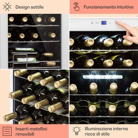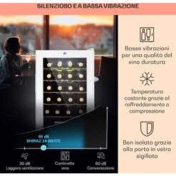 Klarstein Shiraz Cantinetta Vino, Cantina Vino Refrigerata a Zona Singola per Prosecco e Bottiglie di Birra, Con Pannello Touch, Frigo Vino per Esterno/Interno, 5-18°C, 63 Litri, 24 BottiglieLa cantinetta da vino refrigerata da 24 bottiglie ti consente di costruire e conservare una squisita collezione di vini. I frigo vino sono costruiti appositamente per proteggere una collezione di vino dai danni causati da temperature di conservazione errate, umidità, luce, vibrazioni o scarsa qualità dell’aria. Questa cantina per vino non integrata è super sottile e si adatta perfettamente a qualsiasi casa, sala degustazione, cucina o area bar interna/esterna, offrendo un rapido accesso ai tuoi migliori vini refrigerati alla loro temperatura ideale.Per Vino Bianco, Rosso e RoséIndipendentemente dalle tue preferenze, questo frigo vino a zona singola ti dà il pieno controllo del clima di conservazione. La zona di raffreddamento può essere impostata a 5-18°C, ideale per i vini rossi, bianchi, rosati, prosecco e champagne. I tuoi vini possono essere organizzati nei suoi ripiani in metallo e all’interno troverai spazio a sufficienza per conservare anche bottiglie di champagne per eventi speciali.Elegante e IntuitivoLa conservazione del vino è questione di stile. Questa cantinetta vino ti consente di mantenere la freschezza e integrità dei tuoi vini con eleganza. Il frigo vino adatto anche alla conservazione di bottiglie di birra ha una struttura in acciaio inossidabile con un vetro panoramico a doppia parete per dare lustro alla tua collezione. Questa cantina per vini è facilmente controllabile da un pannello touch che ti consente di impostare facilmente la temperatura interna.temperature. Caratteristiche del prodotto:- Cantinetta vino refrigerante a zona singola per 24 bottiglie- Conservazione senza vibrazioni- 5 ripiani in metallo rimovibili- Schermo LCD con display della temperatura- Dimensioni: 43 x 74.5 x 45 cm