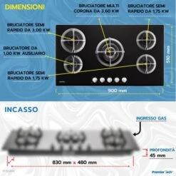 I piani cottura a gas a marchio PremierTech sono una scelta tradizionale e già ben collaudata nel tempo, con i quali sarà davvero difficile sbagliare. Il modello PC5G90V consente di soddisfare esigenze diversificate e di portare a termine diverse preparazioni allo stesso tempo evitando inutili sprechi. La cottura, infatti, avviene grazie al calore sprigionato dalla fiamma accesa dalla scintilla. Quest’ultima viene generata dai controlli frontali, aspetto comodo, visto che non è richiesto l’uso di due mani. La regolazione del calore è inoltre istantanea e precisa, così da personalizzare la cottura in base alle specifiche necessità. PremierTech PC5G90V integra cinque distinte zone di cottura, cioè un bruciatore multi corona wok da 3.60 kW, uno rapido da 3.00 kW, due semirapidi da 1.75 kW e uno ausiliario da 1.0 kW. Questo prodotto dispone del sistema di blocco del gas, che si attiva automaticamente in caso di spegnimento involontario della fiamma.