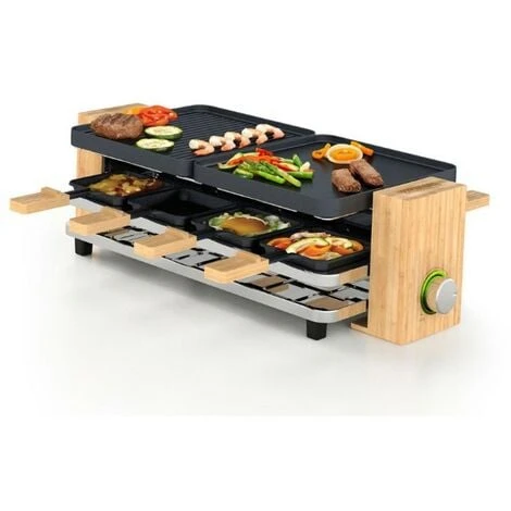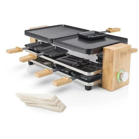 La Raclette Pure 8 di Princess è una pratica ed elegante raclette per 8 persone. Con la raclette tutti possono preparare il proprio piatto a tavola! Il grill superiore è realizzato in alluminio pressofuso di alta qualità ed è diviso in due piastre reversibili con un lato piatto e uno scanalato, che ti permette di ottenere le striature tipiche della cottura alla griglia. Il set è inoltre composto di 8 padelline con manico super pratiche, che possono essere appoggiate calde sul piano apposito per evitare di macchiare la tovaglia e 8 spatole di legno per girare e prendere in sicurezza il cibo senza danneggiare il rivestimento antiaderente. La Raclette Pure 8 ha finiture in bambù, un materiale resistente e durevole che resta freddo al tocco per permetterti di spostare la raclette in tutta sicurezza.