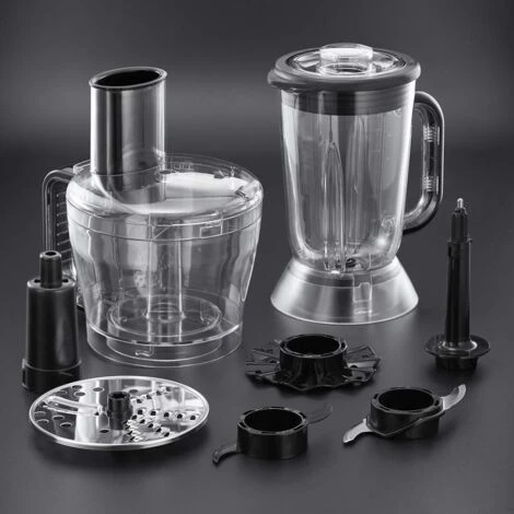 Robot da cucina, Contenitore 2.5L, Bicchiere 1.5L, Lama in acciaio, Disco emulsianoatore, Disco per affettare/grattuggiare, gancio da impasto