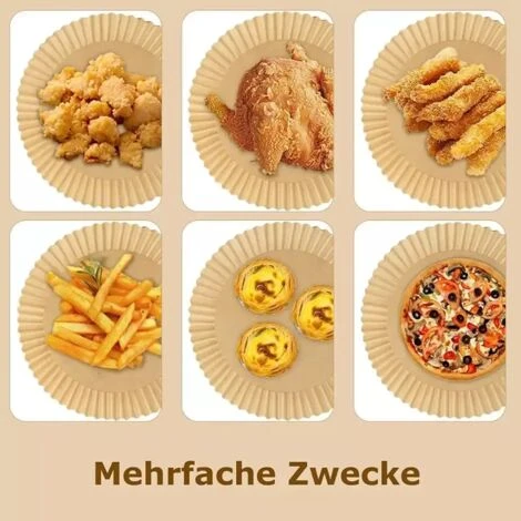 La carta per friggitrice ad aria è resistente al calore fino a 428 gradi Fahrenheit / 220 gradi Celsius e può essere utilizzata in friggitrici ad aria, forni convenzionali e forni a microonde.