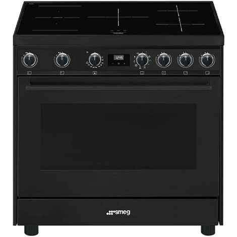 Smeg C91IEA9. Tipo di prodotto: Cucina, Colore del prodotto: Nero, Tipo di controllo: Manopola, Touch. Tipo di piano cottura: Piano cottura a induzione, Numero totale di fuochi: 5 Fornello(i). Dimensione del forno: Largo, Capacità netta del forno: 115 L, Potenza grill: 2900 W. Classe efficienza energetica: A, Consumo energetico (convenzionale): 0,98 kWh, Potenza aggregata (elettrica): 10600 W. Larghezza: 900 mm, Profondità: 600 mm, Altezza: 900 mm