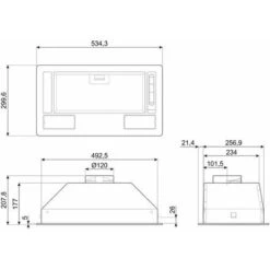 Smeg KSG52HE. Potenza massima di estrazione: 368 mⁿ/h, Classe di efficienza dinamica del fluido: E, Classe di efficienza luminosa: D. Tipo: Integrato, Colore del prodotto: Argento, Potenza lampadina: 3 W. Tipo di filtro antigrasso: Alluminio, Numero di filtri: 1 pz. Classe efficienza energetica: D, Consumo energetico annuo: 71 kWh, Carico di collegamento: 146 W. Larghezza: 534 mm, Profondità: 300 mm, Altezza: 208 mm
