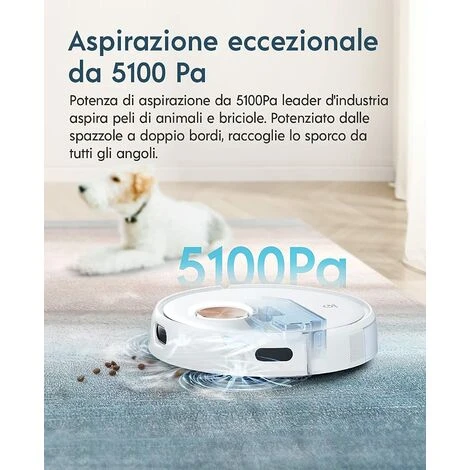 la potenza di aspirazione da 5100Pa leader d’industria aspira facilmente peli di animali e briciole. Potenziato dalle doppie spazzole laterali, raccoglie lo sporco da tutti gli angoli.