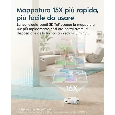 rispetto alla mappatura visiva, la tecnologia yeedi 3D ToF esegue la mappatura 15x più rapidamente, così ora potrai avere la disposizione della tua casa in soli 5-10 minuti.